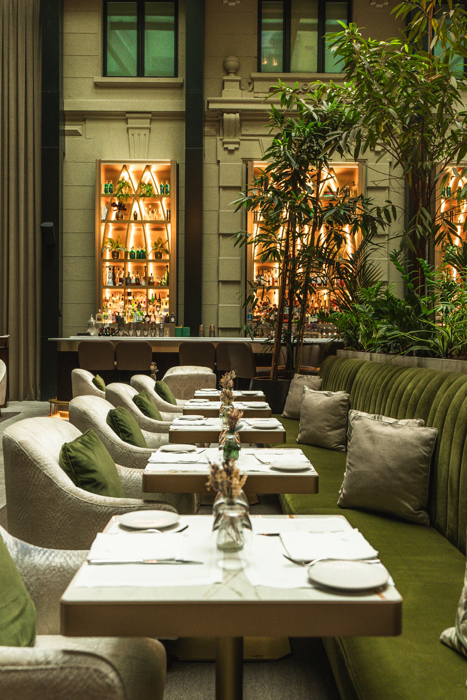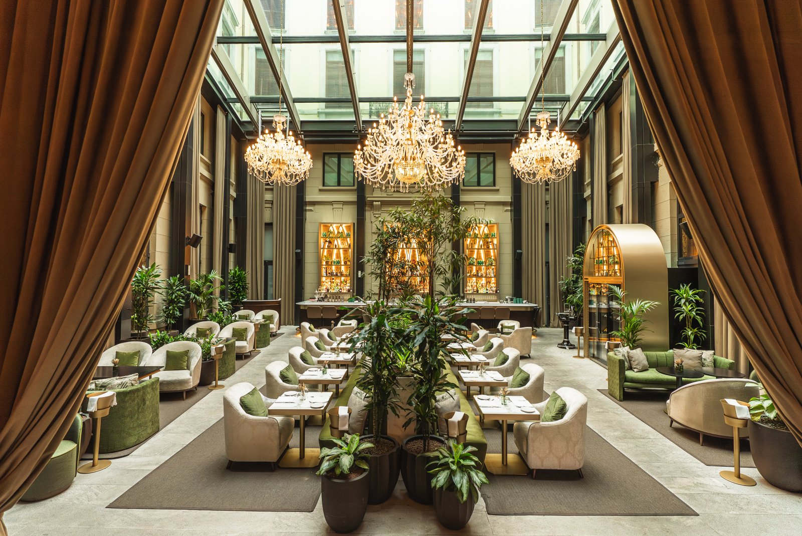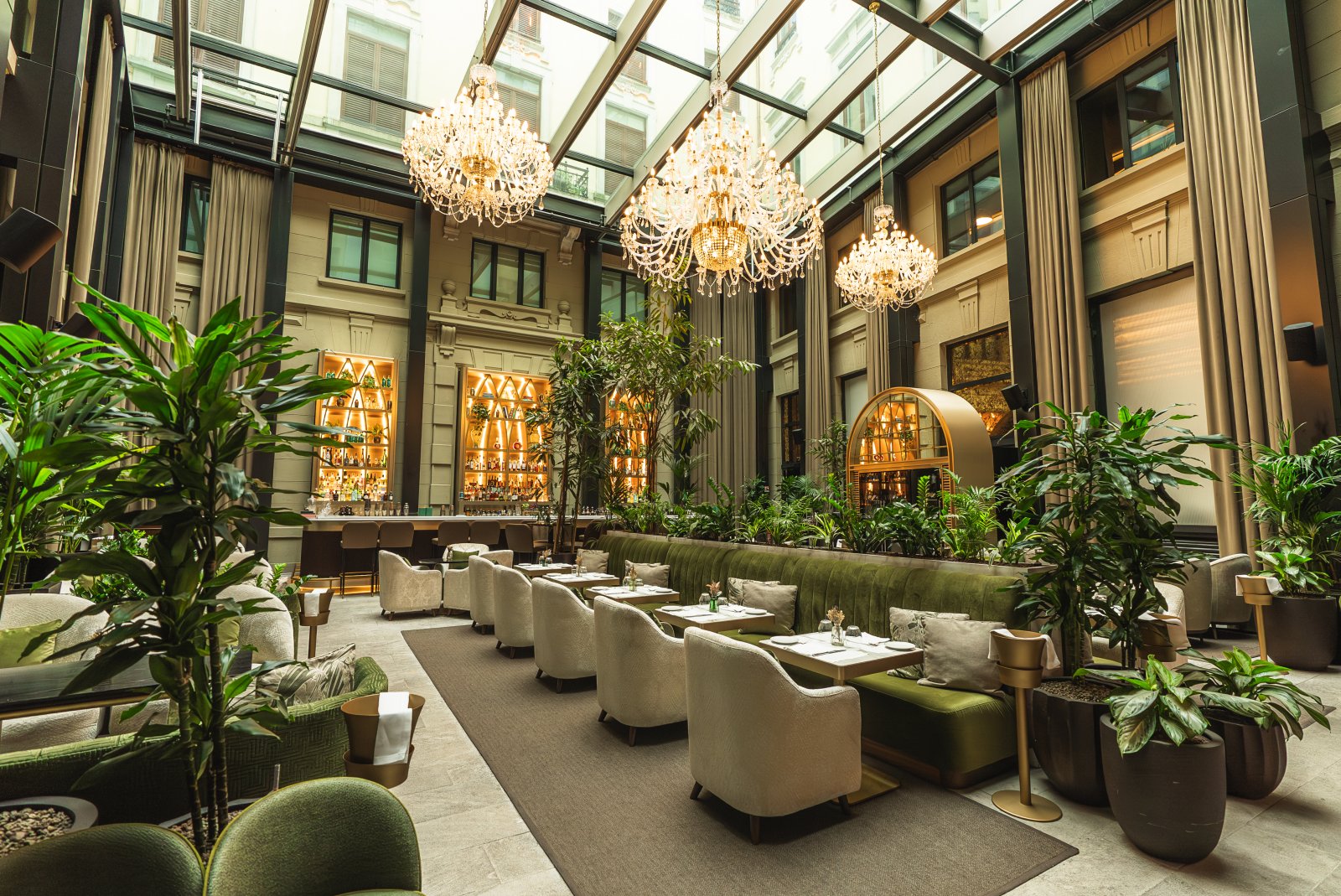 The interior evokes a sophisticated garden through a palette of greens and golds, fine materials and a carefully curated selection of furniture that reinforces its elegant and welcoming character. The greenery, velvety textures and warm lighting accompany the rhythm of the day, from lunch through to aperitifs and into the evening, creating an enveloping and ever-changing atmosphere.