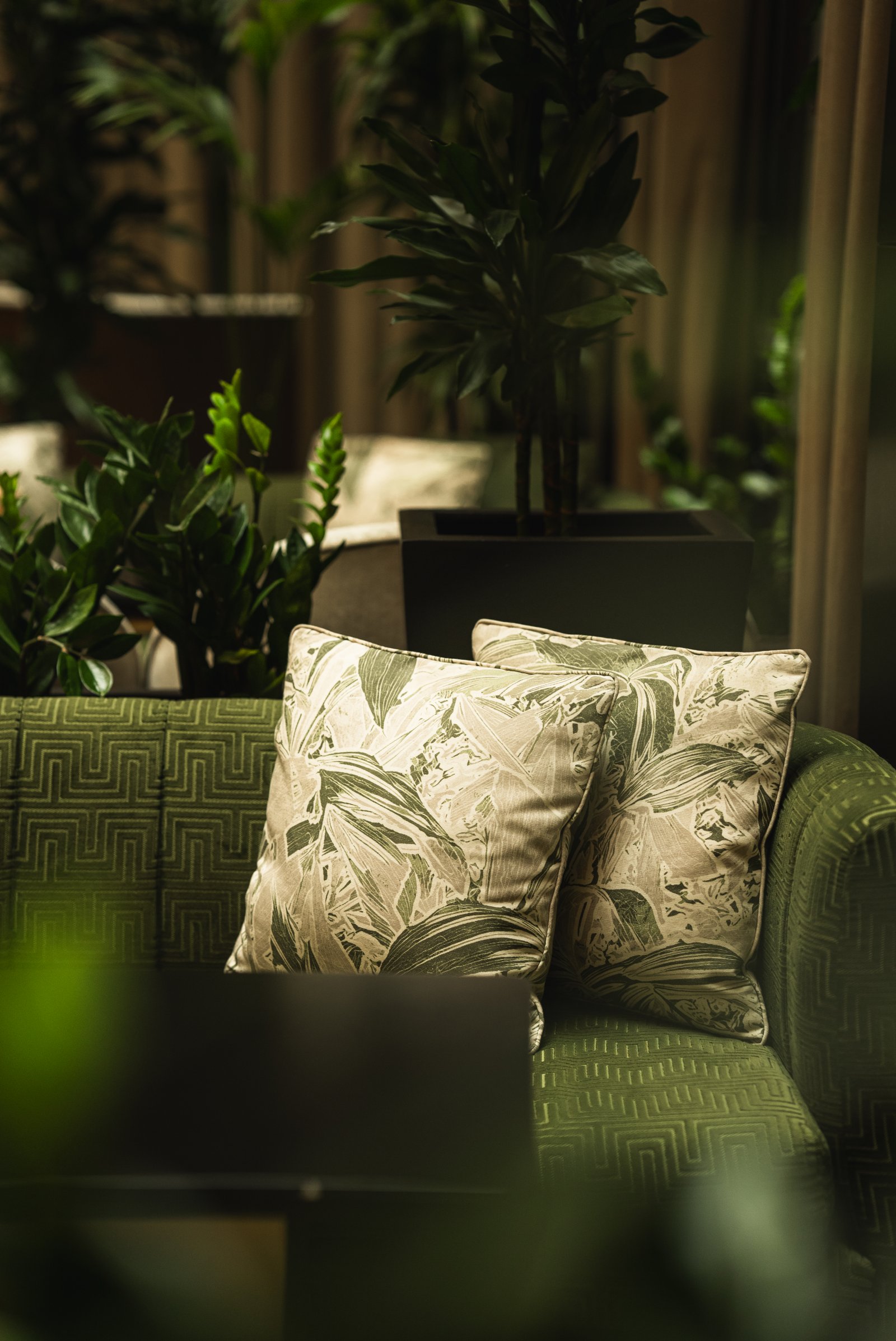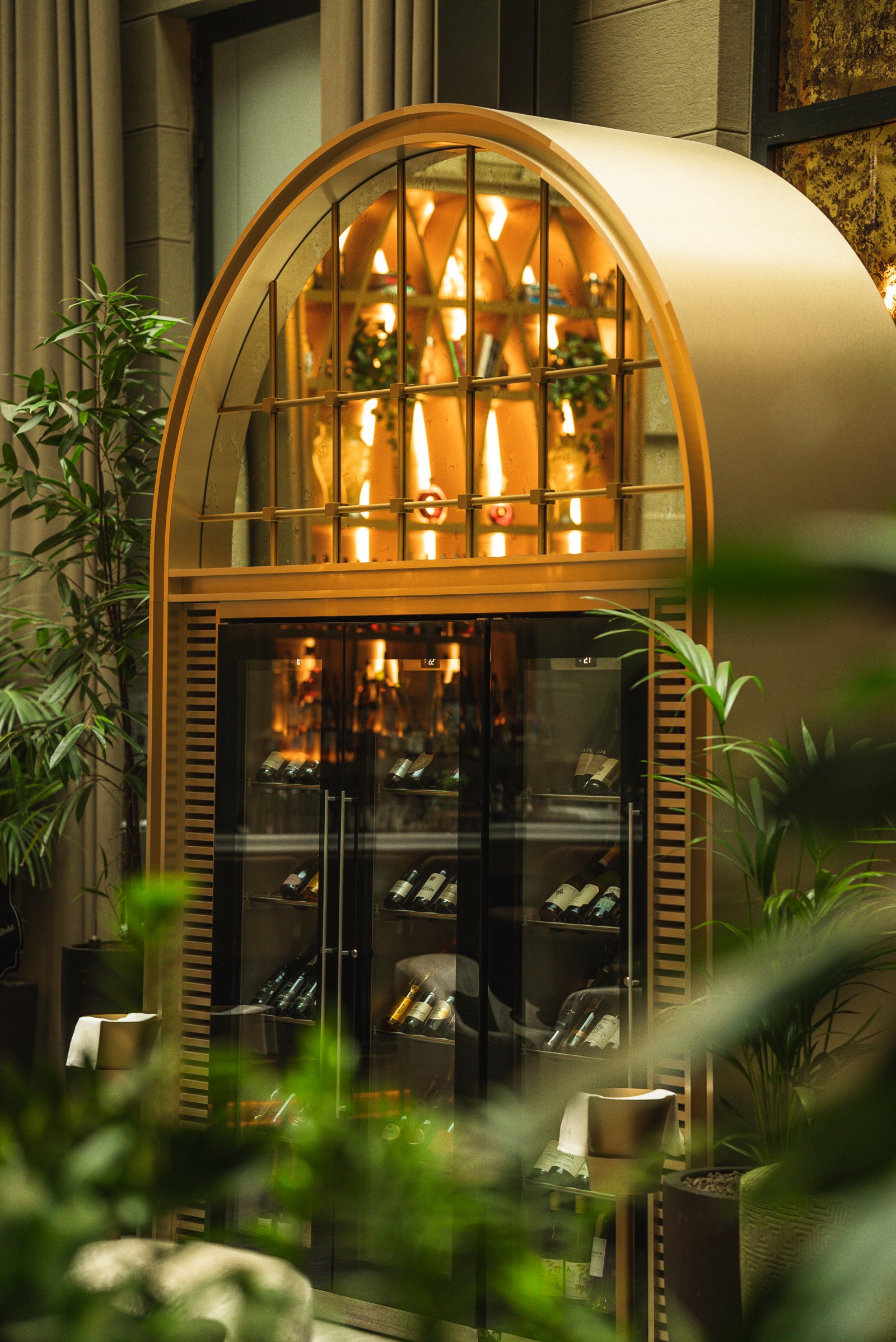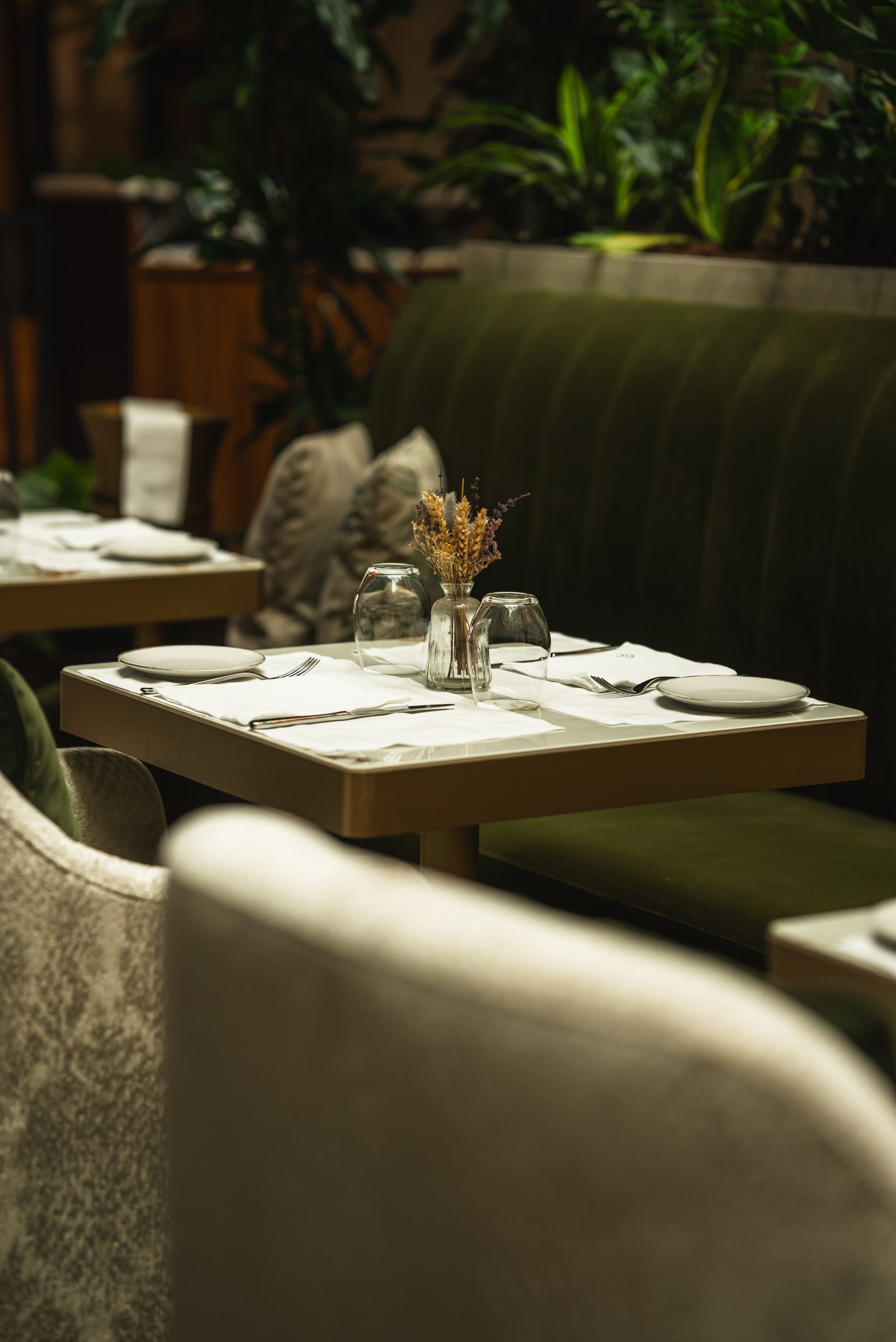 The interior evokes a sophisticated garden through a palette of greens and golds, fine materials and a carefully curated selection of furniture that reinforces its elegant and welcoming character. The greenery, velvety textures and warm lighting accompany the rhythm of the day, from lunch through to aperitifs and into the evening, creating an enveloping and ever-changing atmosphere.