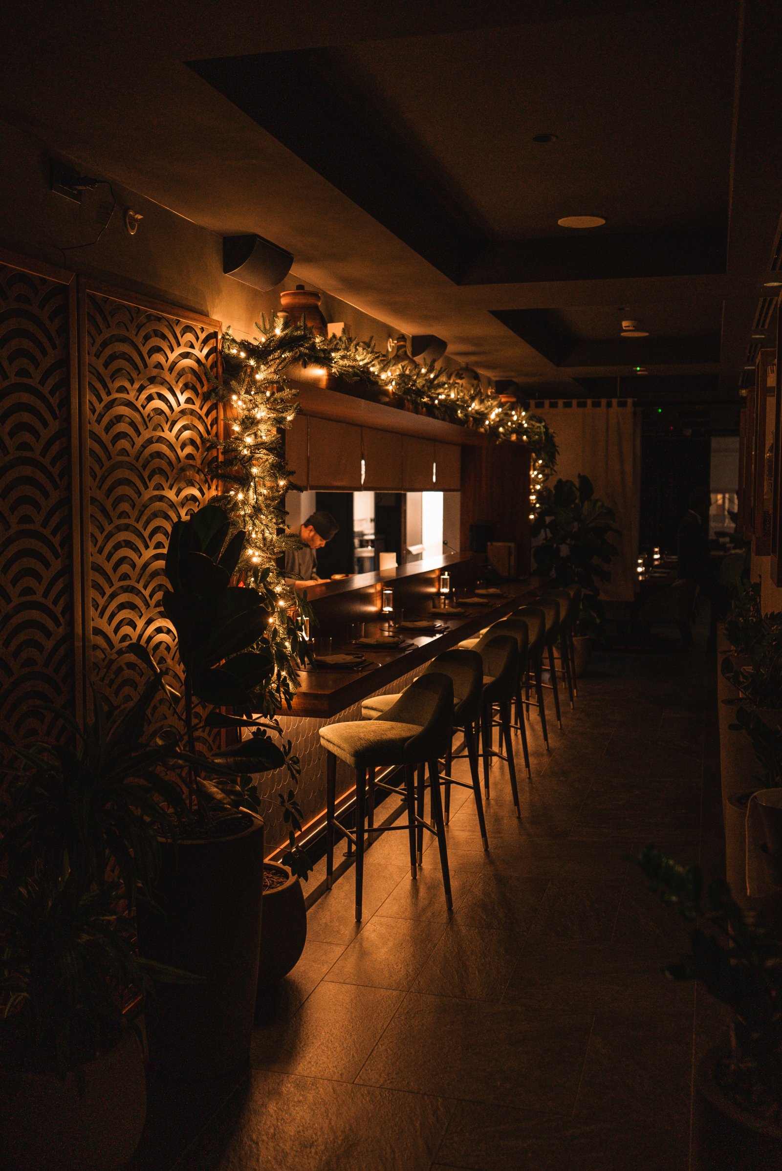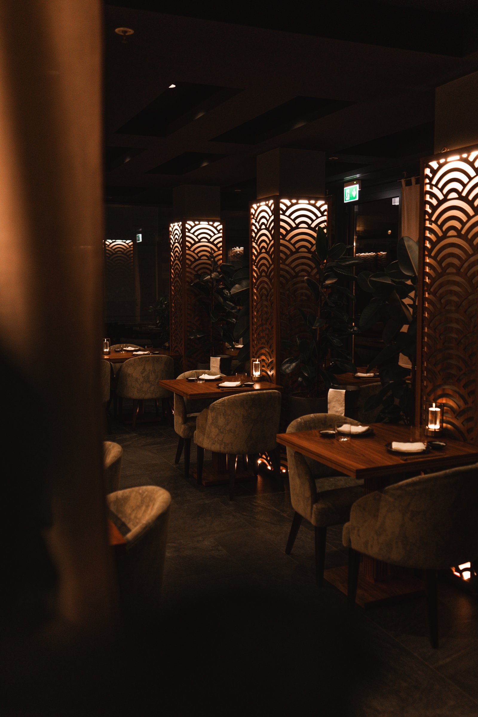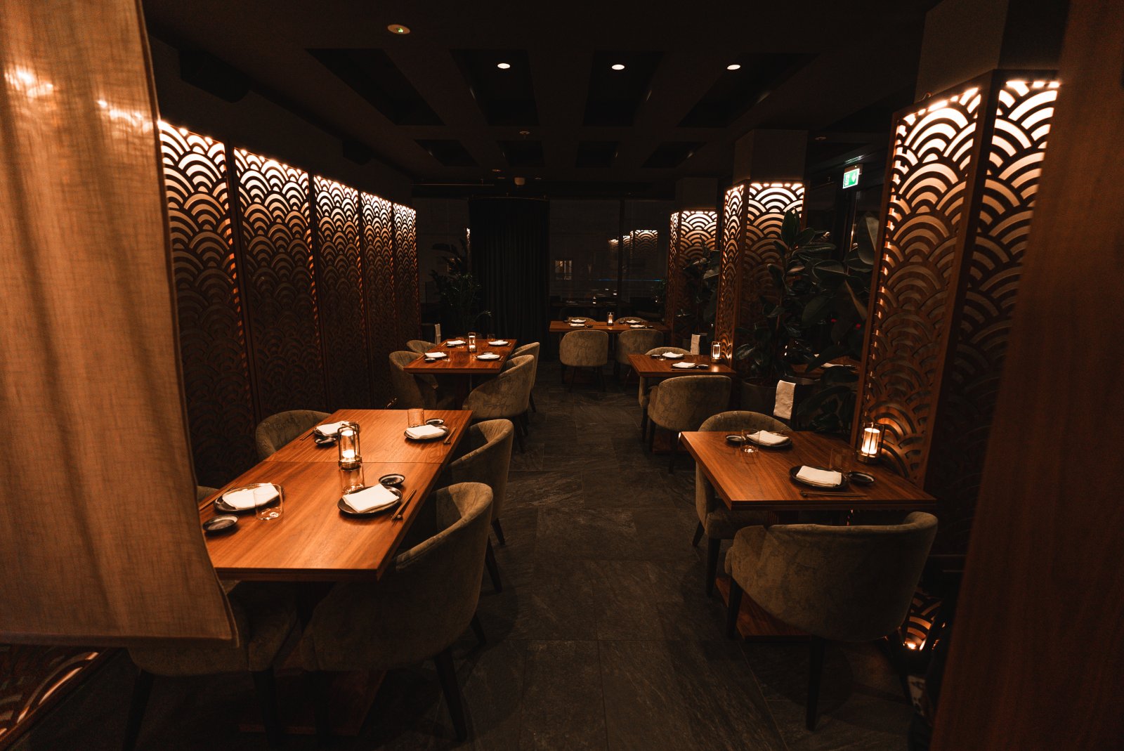 The interior features a minimalist yet warm aesthetic, with a serene atmosphere that complements the dining experience. Wood, neutral tones and soft lighting create an elegant and balanced space.