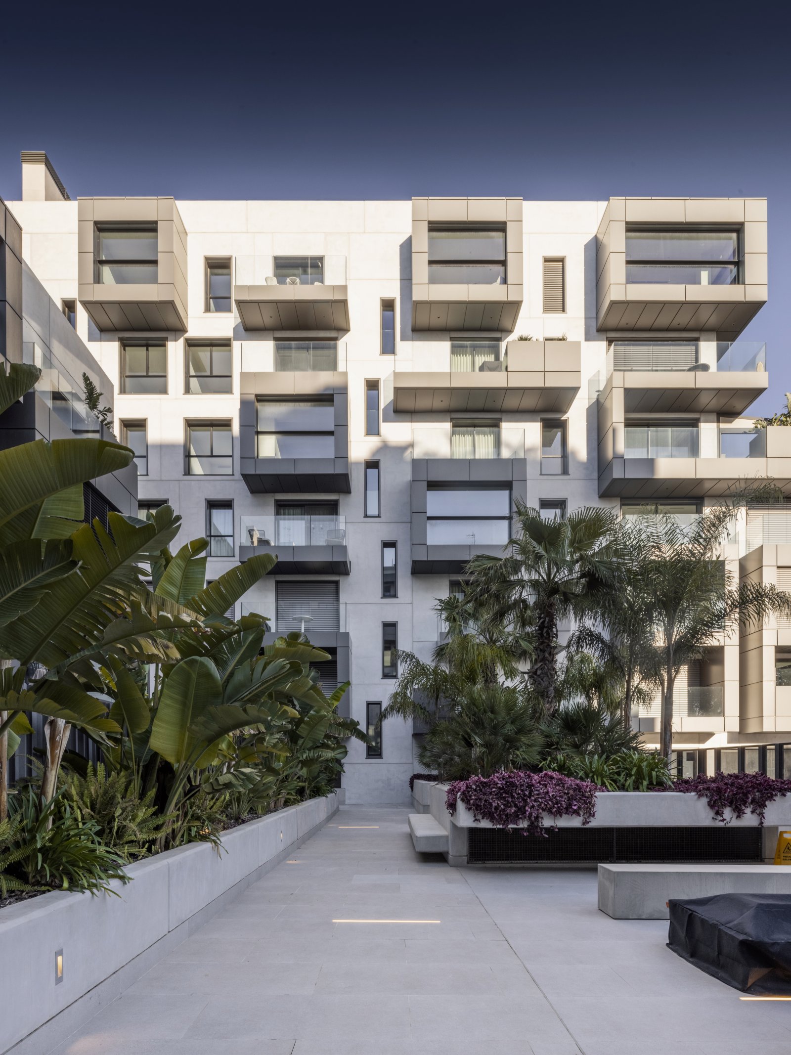 The building is accessed through a large portico that serves as a concierge. The central courtyard is a garden with refined landscaping that gives access to the different blocks and communal areas.