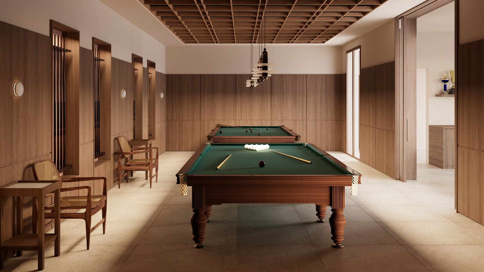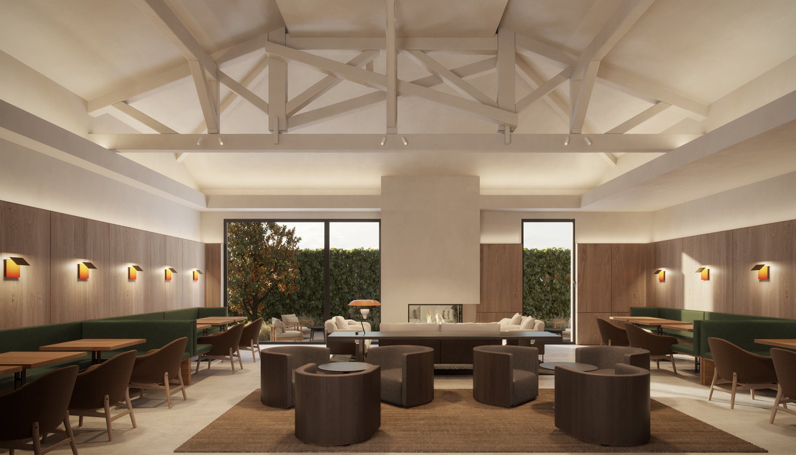El salón, el bar y el restaurante dejan de entenderse como piezas independientes para configurarse como un único espacio continuo, flexible y versátil, capaz de acoger tanto el uso cotidiano como eventos y celebraciones. El sistema permite que estos ámbitos funcionen conjuntamente o puedan compartimentarse según las necesidades del club, aumentando su capacidad de adaptación. Se amplía el bar y se potencian las conexiones con el exterior mediante la apertura y ampliación de huecos en fachada, transformando ventanas en balconeras que incrementan la entrada de luz natural y refuerzan la relación visual con las terrazas y las pistas de tenis. La eliminación de falsos techos permite recuperar la estructura original de cerchas de madera, ganando altura, amplitud y carácter arquitectónico. La chimenea se mantiene como elemento central y simbólico, consolidándose como foco de reunión dentro del espacio social.