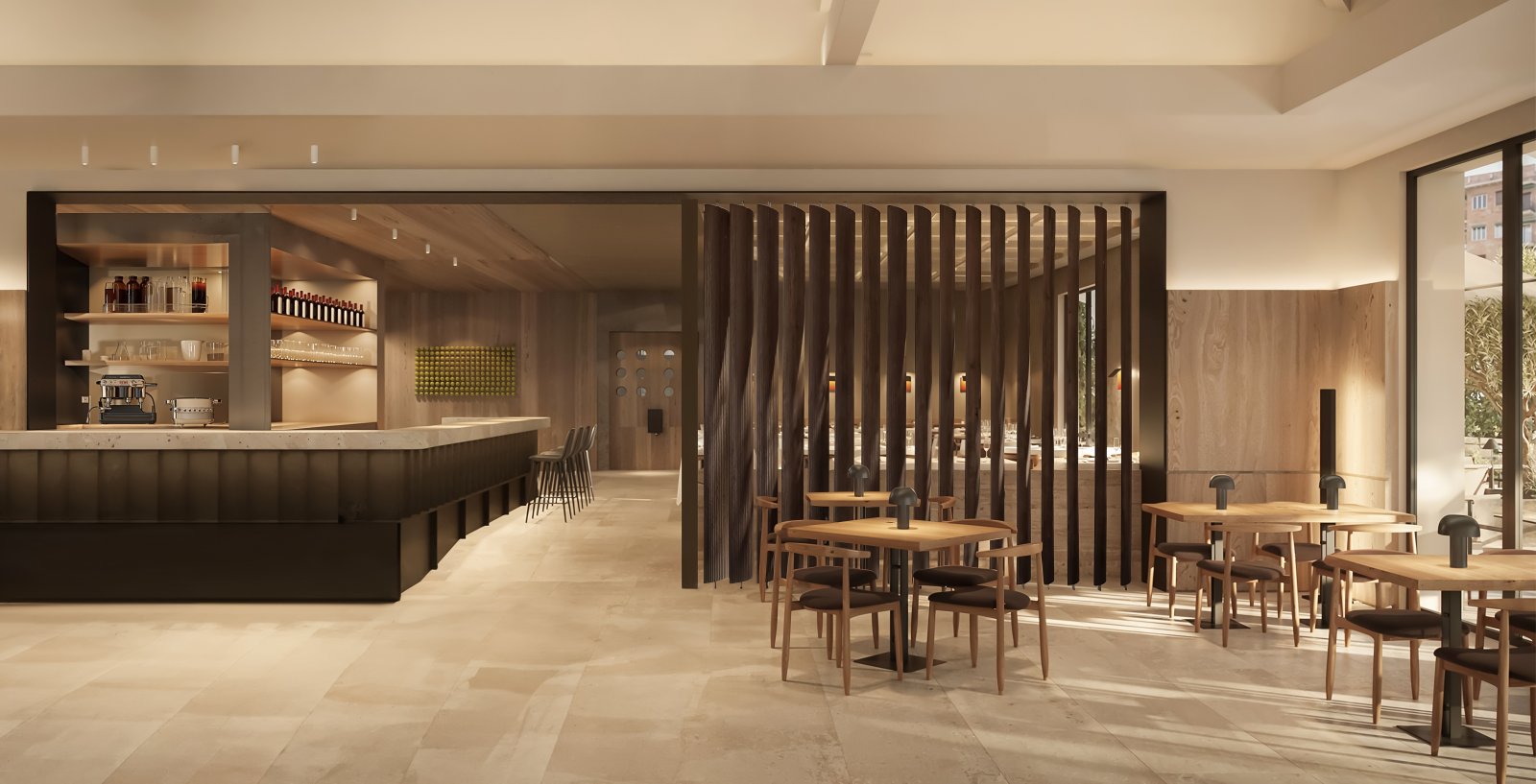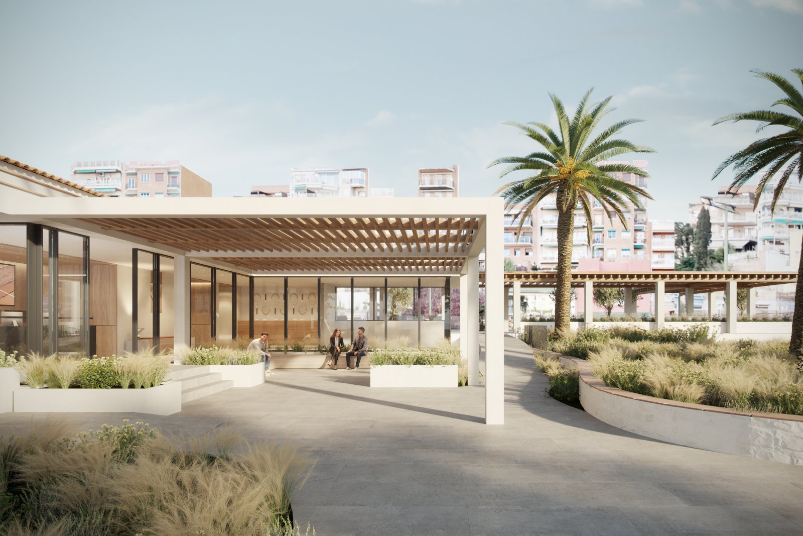 El acceso principal se reubica para dotarlo de mayor visibilidad y representatividad, generando un espacio exterior ajardinado que dignifica la llegada y cualifica la entrada. Se incorpora una marquesina con estructura metálica y lamas de madera que mejora el confort climático y refuerza la identidad arquitectónica del conjunto, manteniendo la transparencia entre recepción y exterior y favoreciendo una relación más directa con el entorno.