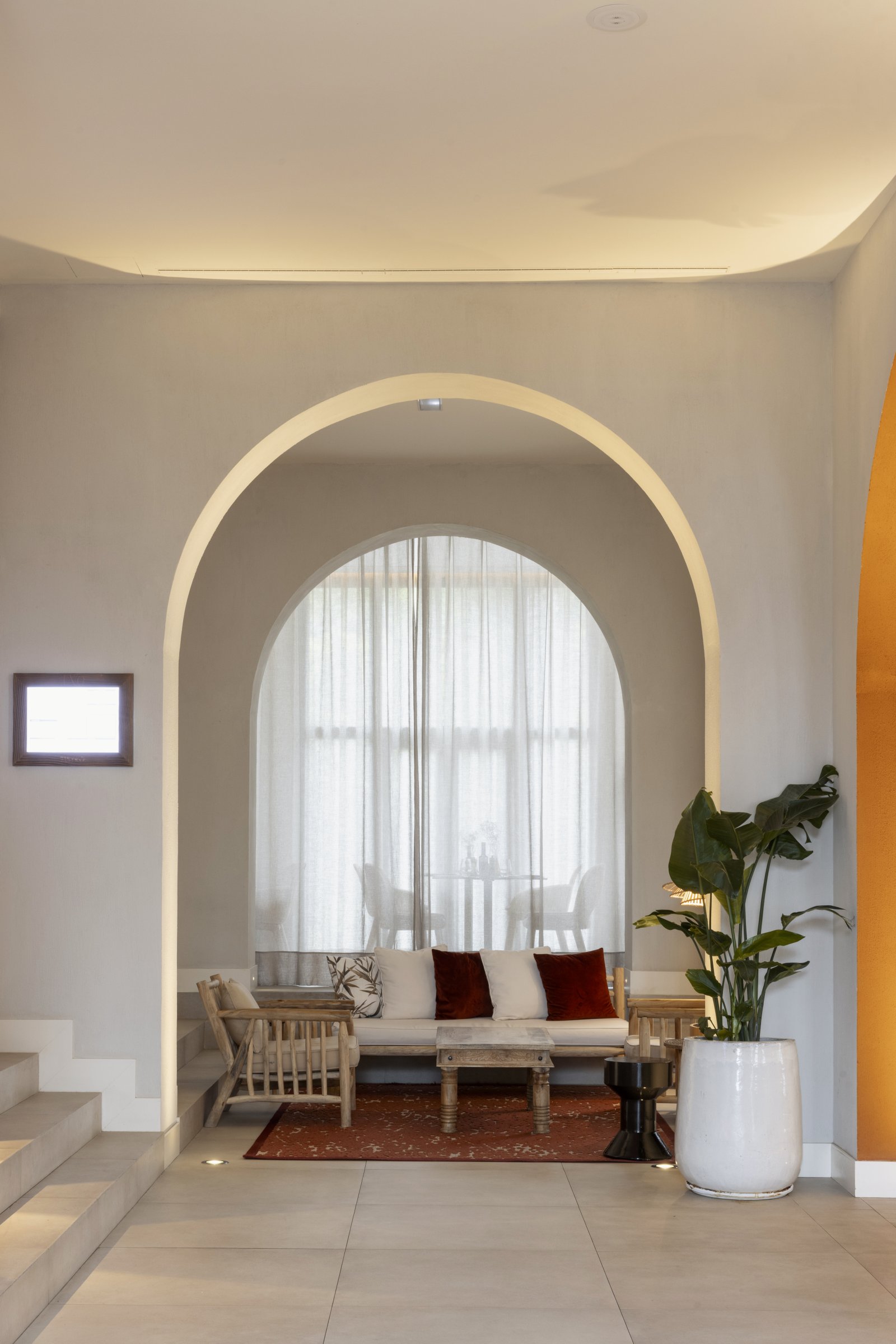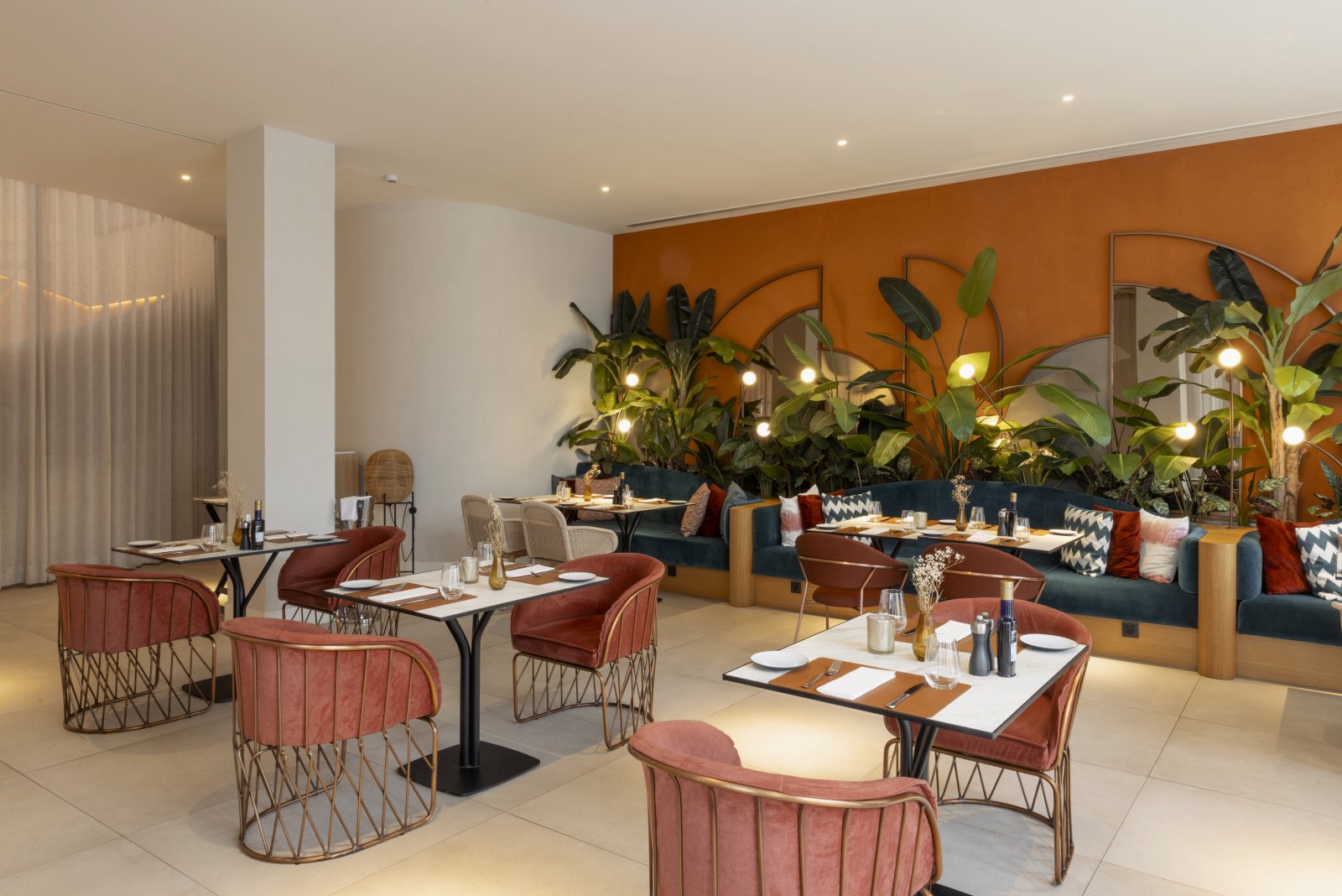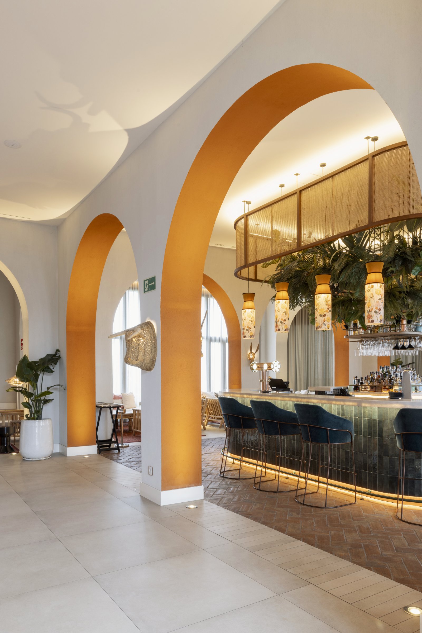 El interiorismo se inspira en la esencia del cortijo andaluz y la actualiza con un estilo moderno y luminoso. Paredes blancas, cerámica artesanal, madera y piedra natural evocan la tradición, mientras los toques de color y el mobiliario contemporáneo aportan frescura y confort.