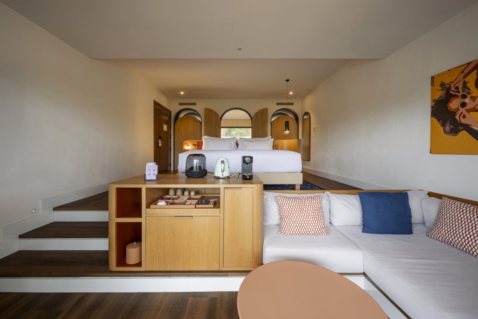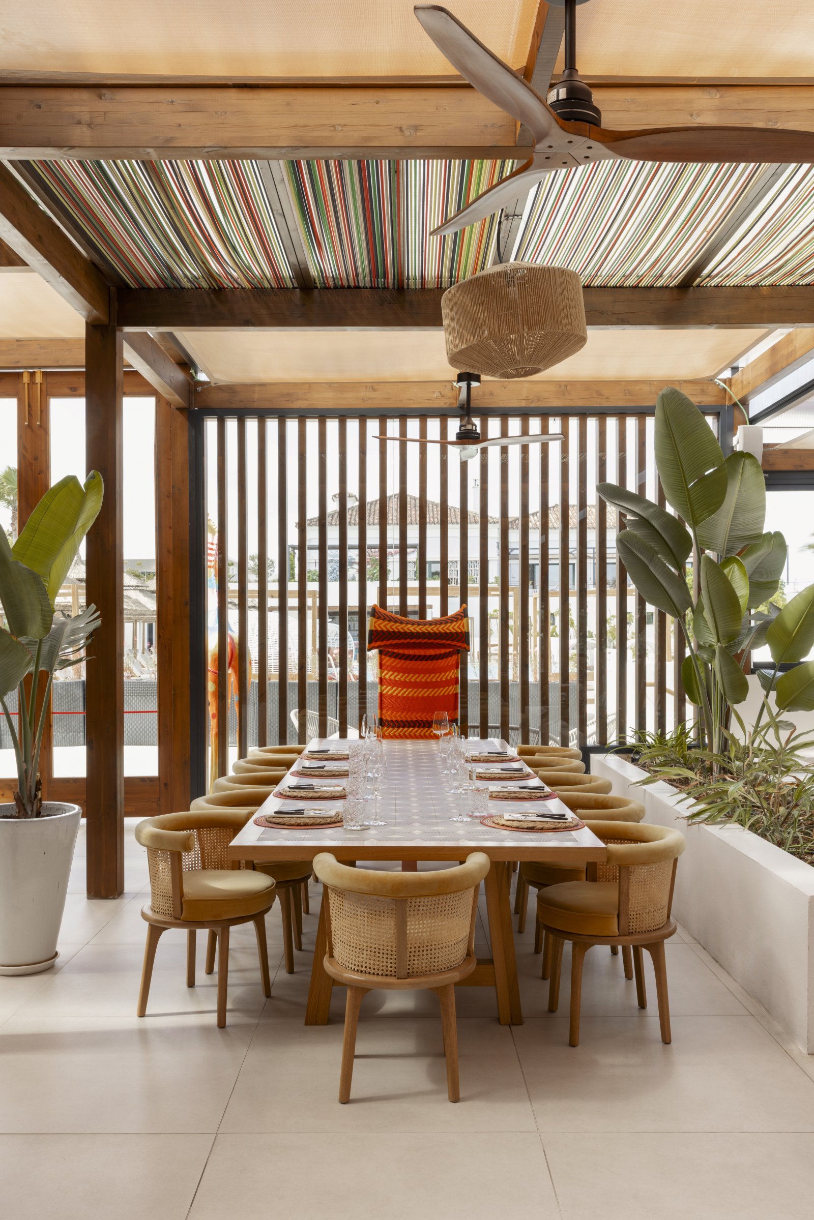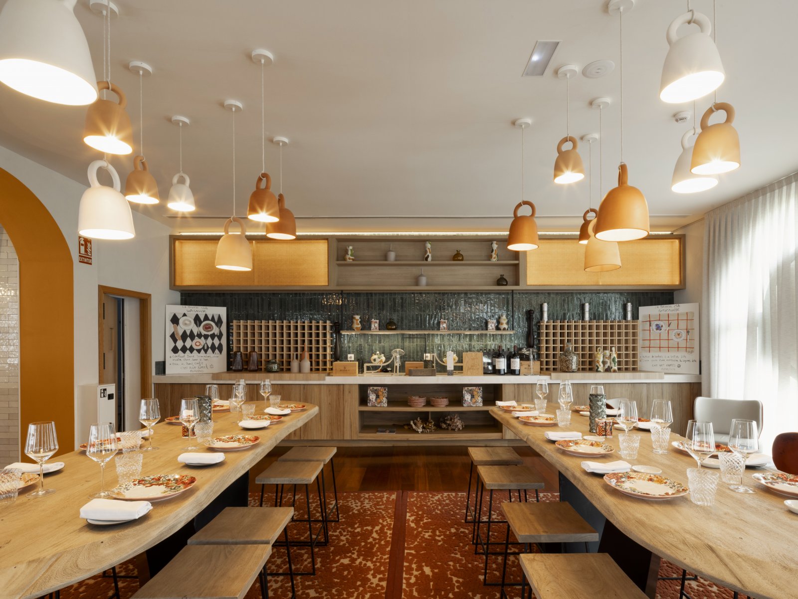 El interiorismo se inspira en la esencia del cortijo andaluz y la actualiza con un estilo moderno y luminoso. Paredes blancas, cerámica artesanal, madera y piedra natural evocan la tradición, mientras los toques de color y el mobiliario contemporáneo aportan frescura y confort.