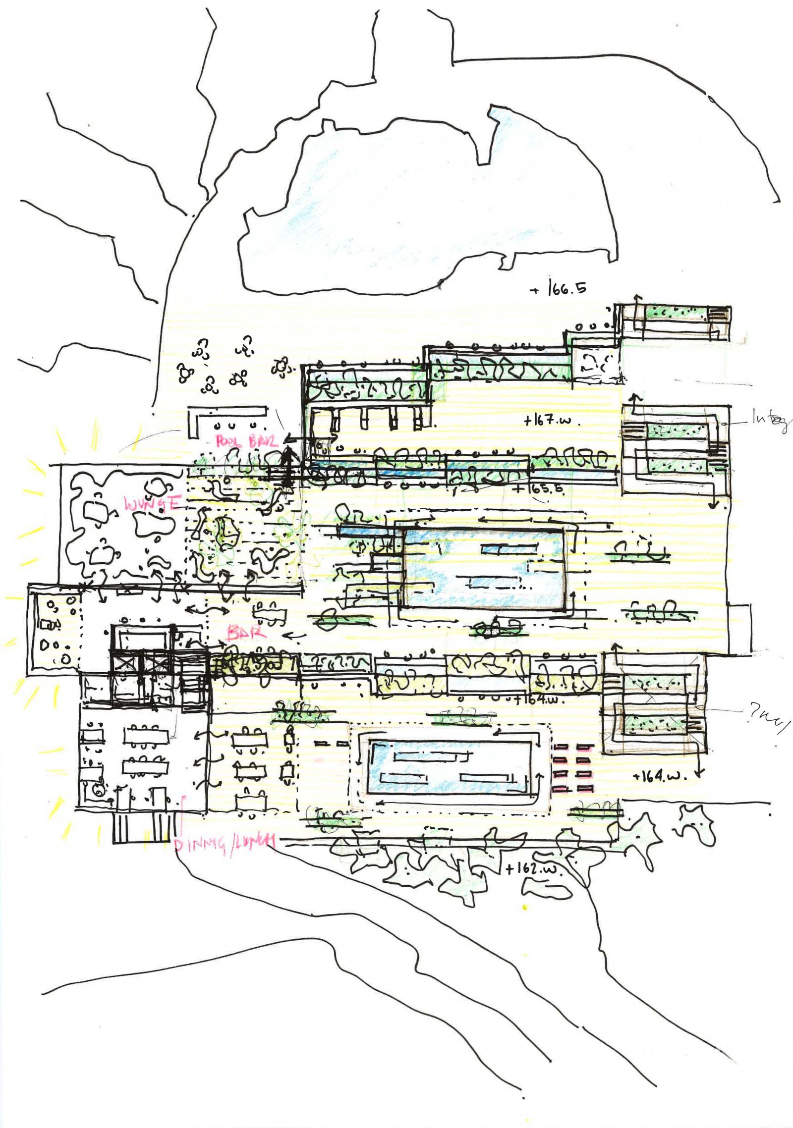 Estas zonas aterrazadas y semienterradas, ajardinadas e integradas a la topografía, ofrecen en sí mismas un espectáculo en el acceso. Sin afectar la privacidad interna en cada uno de los edificios, ni las habitaciones posteriores o las zonas de piscinas y restauración, que se convierten en el núcleo central de la vida y descanso de los clientes.